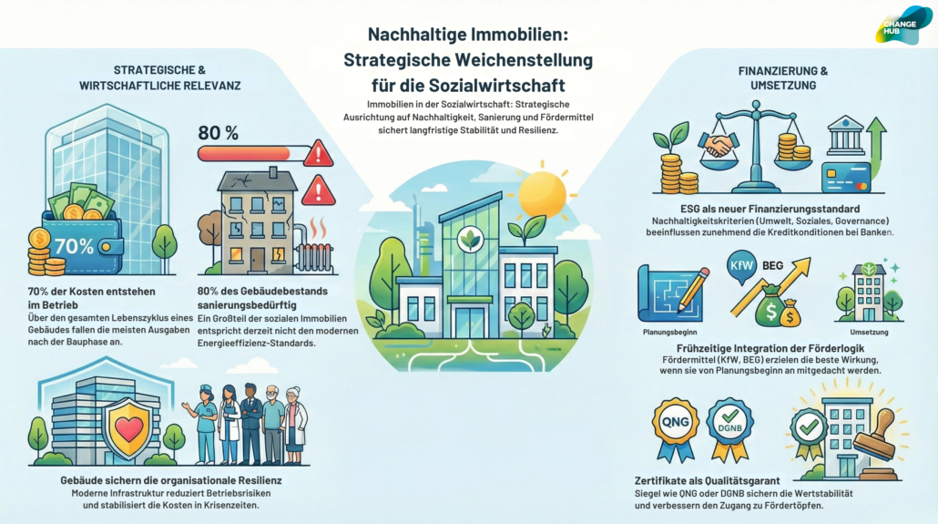 Für soziale Einrichtungen bedeutet das: Immobilienstrategie ist kein Nebenprojekt, sondern Teil der Organisationsentwicklung. Sie beeinflusst Versorgungsqualität, Wirtschaftlichkeit, Arbeitsbedingungen und ökologische Wirkung gleichermaßen.