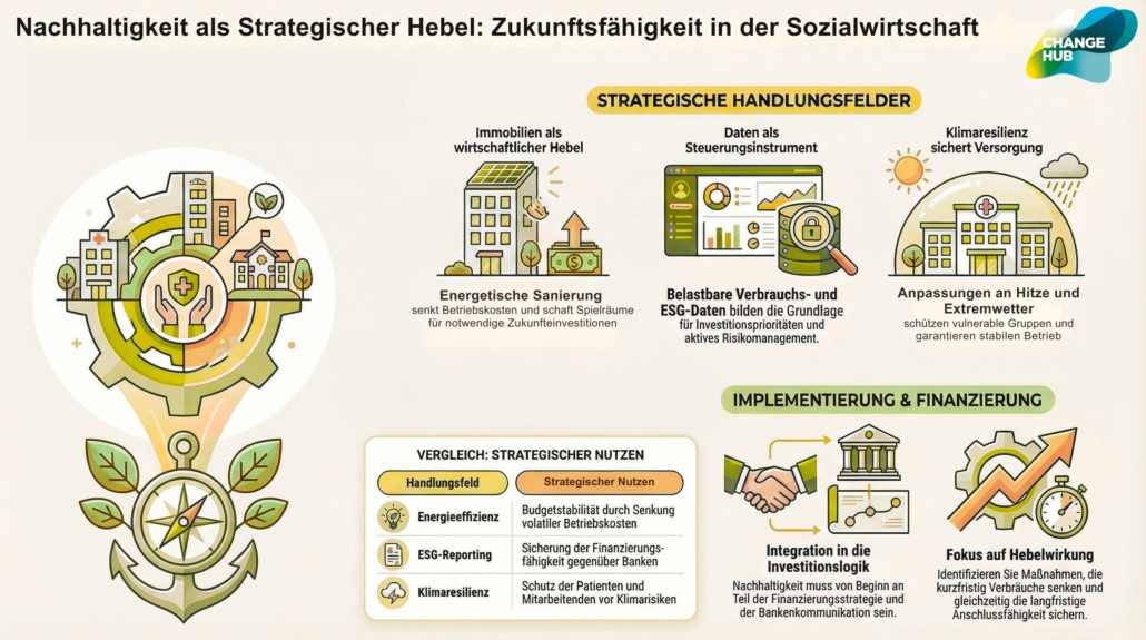Für euch als Organisation bedeutet das vor allem eines: Nachhaltigkeit sollte nicht in einzelnen Fachbereichen hängen bleiben. Wer sie ausschließlich als Bauprojekt, Berichtspflicht oder Fördermittelthema behandelt, unterschätzt ihre strategische Reichweite. In der Gesundheits- und Sozialwirtschaft beeinflusst das Thema die Steuerung der gesamten Organisation.